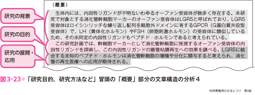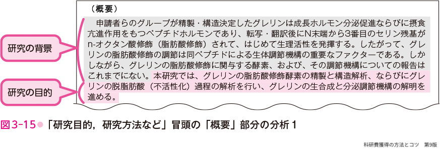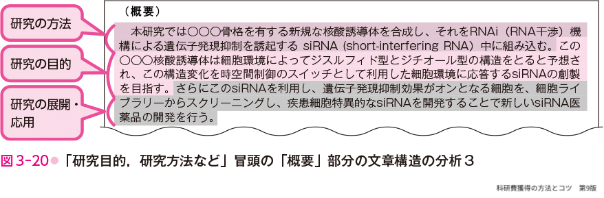 この文章の構造は,研究の「方法」,「目的」,「展開・応用」となっており,肝心の研究の背景と問いが書かれていない(図3-20).しかし,この例のように概要部分に研究の「背景と問い」が抜けていたり,あるいは研究の「展開・応用」が書かれていないものでも,本文を読むと「背景と問い」や「展開・応用」がきちんと書かれている例がほとんどだ.この例のもととなった申請書のなかにもきちんと書かれていた.