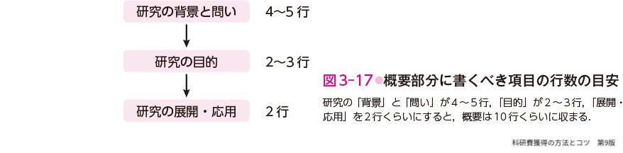 この例では研究の「背景と問い」が大部分を占めて,「目的」が少なくアンバランスなことがわかるだろう.しかも,研究の「展開・応用」にはまったく触れられていない.概要部分は全部で10±2行くらいを目安とすると,「背景」と「問い」に4~5行,「目的」に2~3行,「展開・応用」に2行といったところが適切な分量である(図3-17).