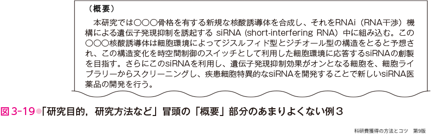 概要に書くべき3つの項目のなかで,書かれていないことが多いのは,研究の「背景と問い」と「展開・応用」である.図3-19に例をあげる.なお,この例は私が以前チェックした申請書を改変して使わせてもらっている.