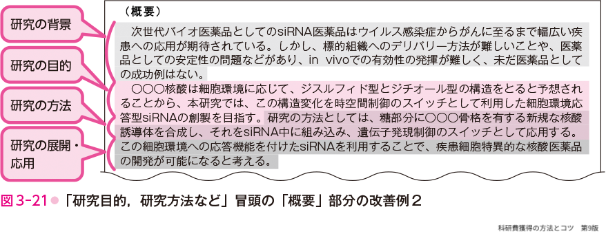 この例の場合,本文から研究の背景と問いに相当する部分を探すと,「次世代バイオ医薬品として期待の高いsiRNA創薬であるが,in vivoで有効性を発揮するのは困難で未だ医薬品としての成功例はない」とあった.これを概要部分に組み込んで整理すると,まとまった概要ができあがる(図3-21).