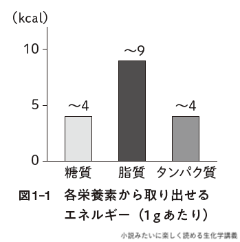 糖質、脂質、タンパク質は、栄養学的には三大栄養素とよばれます。これにビタミンとミネラルを加えて五大栄養素です。これらを区別するものは、エネルギーです。三大栄養素はすべて高分子であり、多くのエネルギーが取り出せます。1グラムあたりの平均値を図1-1に示します。脂質が9キロカロリーと断トツで大きいですね。脂質の成分である脂肪酸やコレステロールは、27個の炭素を含む化合物で、多くの化学結合のエネルギーを含んでいます。