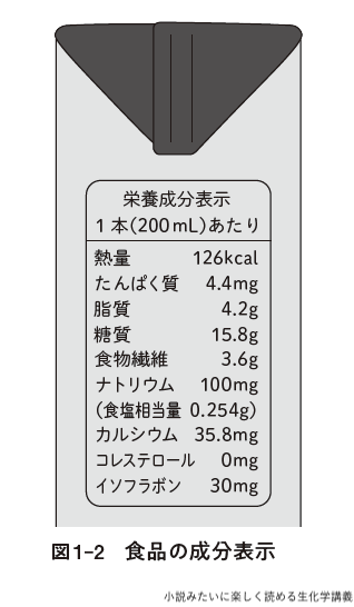 皆さんがスーパーやコンビニで食品を購入する時に、そのパッケージを注意深く見てみてください。おそらく図1-2のような表示があります。これは、食品表示法により定められていて、一部の食品を除いて必ず表示しなければなりません。先ほど触れた三大栄養素(糖質、タンパク質、脂質)の他に、五大栄養素のビタミン、ミネラルなどの量も記載されています。エネルギー(熱量)は必ず先頭に表示されていて、キロカロリーという単位で表されます。このカロリーはエネルギーを示す単位の1つです。おにぎり1個だと約200キロカロリー、食パン1枚もおよそ200キロカロリーといった具合です。
