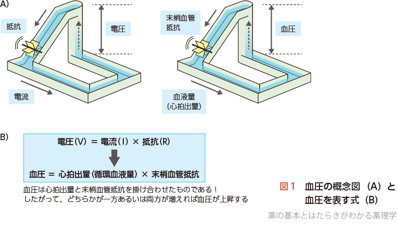 同様に,血圧も「血圧=心拍出量(循環血液量) ×末梢血管抵抗」であらわされる(図1B).つまり,心臓から拍出される血液量を血管抵抗に逆らって全身に流し切るための圧力が血圧になる.よって,血圧は,心拍出量が増加したり,あるいは血管の抵抗が増大したりすることで高くなる.言い方を変えれば,血液を全身に流し切るためには,それだけの血圧が必要ということである.高血圧患者においては,血圧上昇の原因を推察することで,多くの降圧薬のなかからなぜこの薬が処方されているか,その理由がわかるだろう.