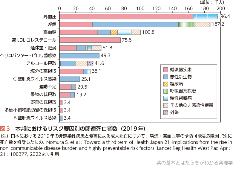 血圧が高いことで生じる身体的症状は少ない.頭痛や肩こりなどが起こることもあるが,収縮期血圧が200 mmHgを超えても無症状の人もいる.高血圧の問題点は,脳梗塞や心筋梗塞などの,死亡や生活の質の低下を招く後遺症を起こす大きな病気を誘発する「要因」になることである.図3に示すように高血圧は死亡につながる最も危険な要因であり,循環器疾患を起こす要因としても強力なものであり,高血圧をきちんと治療することは将来の「大病」を予防するためにとても重要である.その意味から高血圧は「サイレントキラー」といわれている.痛みやつらさがない状態で,長期間にわたって高血圧の薬を飲んでもらうためには,薬を飲む意義を高血圧患者にしっかり認識してもらうことがたいへん重要である.