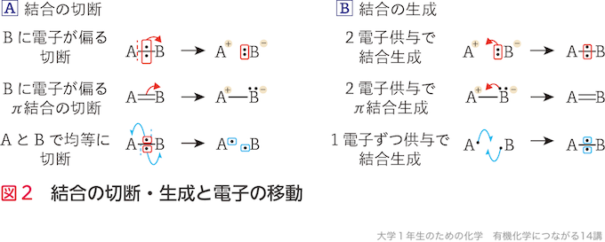 有機分子の変化とは,その分子を構成する原子の増減や配置の変化が起こることであり,それは結合の切断と新たな結合の生成によって行われる.ある原子間で共有結合しているということは,その原子間に共有電子対が存在していることを意味する.したがって,ある原子間で結合の切断が起きるには,共有電子対を構成する2つの電子がどちらかの原子に偏る,もしくは2つの原子に 1電子ずつ分配する必要がある.逆に,結合の生成が起きるには1つの原子がもう1つの原子に2電子を供与するか,2つの原子が1電子ずつを出し合うことで共有電子対を形成する必要がある.この結合の切断,形成を理解するためには,電子や結合の動きを「巻矢印」で書けるようになることが近道である(図2).
