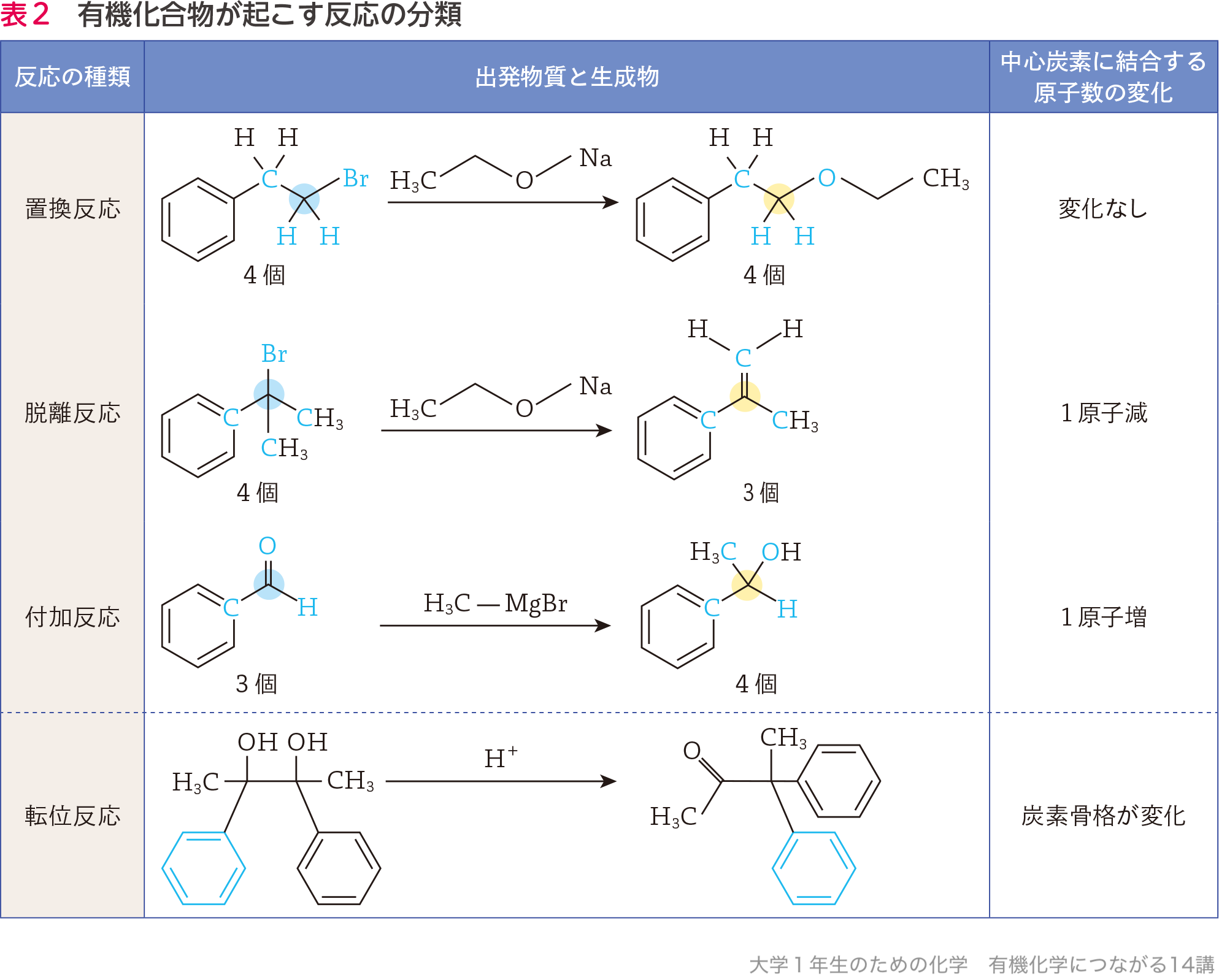 ① 出発物質と生成物を見比べて,変化のあった中心炭素原子を見つける(表2青丸).