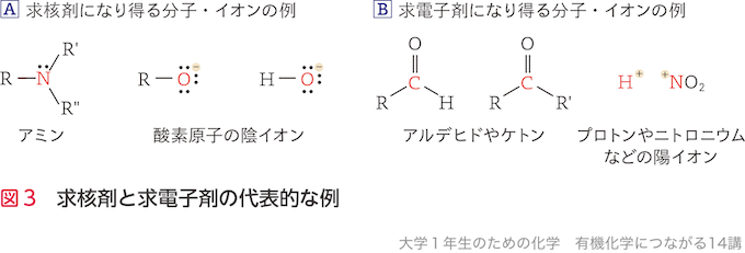 有機化合物における反応では,非共有電子対やπ電子をもつ原子が,電子不足な原子にその電子対を与えることで,共有結合を新たに形成することが多い.電子不足な原子(主に炭素原子)に近づいて結合しようとする電子過剰な分子やイオンを求核剤や求核試薬と呼び,この性質を求核性と呼ぶ.逆に,電子過剰な原子に近づいて結合しようとする電子不足な原子をもつ分子やイオンを求電子剤や求電子試薬と呼び,この性質を求電子性と呼ぶ(図3).
