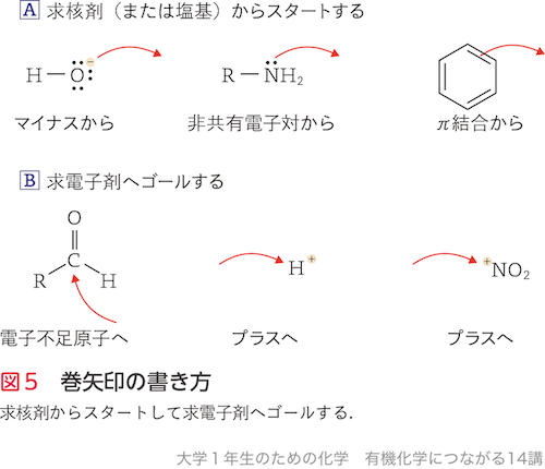 有機化学反応は,非共有電子対やπ電子の動きを「巻矢印」で書く.巻矢印は求核剤からスタートして求電子剤へゴールするように書く.巻矢印の書き方を理解することによって,有機反応のメカニズムを体系的に理解できるようになる(図5).