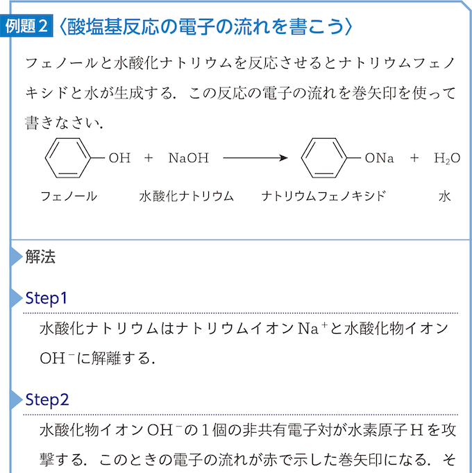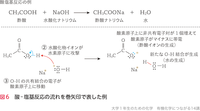巻矢印で反応の流れを表した例として酢酸と水酸化ナトリウムとの反応を図6に示す.