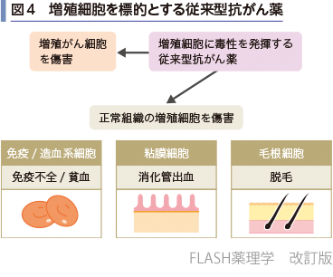従来型の抗がん薬は正常細胞であろうとがん細胞であろうと,とにかく増殖している細胞を傷害する.がん細胞は体内の最も増殖がさかんな細胞よりもさらに活発に増殖しているために,従来型抗がん薬はがん細胞により毒性を発揮する.しかし,正常な細胞でも活発に増殖している細胞には毒性を発揮するため,免疫抑制,脱毛,消化管出血(粘膜傷害)などの有害作用が共通して存在する(図4).