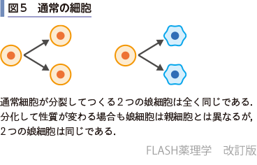 幹細胞の定義は,「自己複製と分化能をもった細胞」ということである.細胞分裂の際,娘細胞2個ができる.幹細胞では,細胞分裂して,普通は通常の細胞と同様に,自分と同じ細胞2個をつくり出す(図5).しかし,時として,娘細胞の1個はそのまま自分と同じだが,もう1個は全く別の細胞へ分化していく細胞をつくり出す(図6).がんにもあまり分裂しないがん幹細胞が存在し,時として異常に分裂するがん細胞をつくり出しているらしい.あまり分裂しないがん幹細胞は従来型抗がん薬が無効である.
