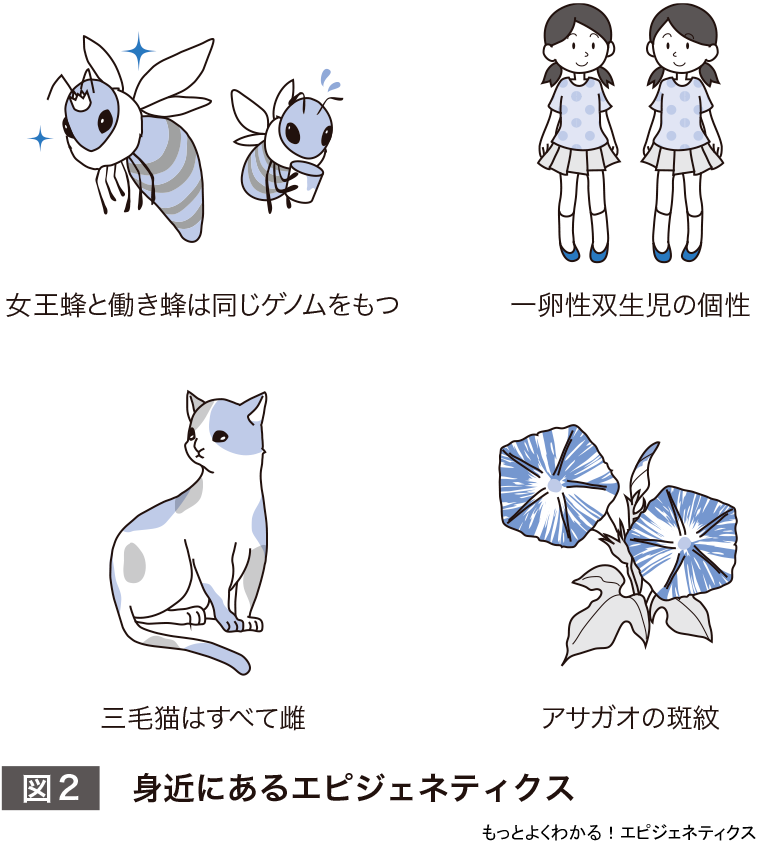 犯罪現場に残された毛根細胞のゲノムDNAからでも,血液細胞のそれからでも,DNA鑑定で犯人を突き止めることができる.これは同じ人なら,違う細胞でもすべて同じゲノムDNA(塩基配列)を有しているからである.では毛根細胞と血液細胞の見た目や機能の違いはどう説明したらいいのだろう? なぜ一卵性双生児は同じゲノムDNAをもつのに,違い(個性)があるのだろう? なぜ同じゲノムDNAをもつミツバチの幼虫が,ローヤルゼリーを与えられたか否かで,女王蜂になったり,働き蜂になったりするのだろう? なぜ三毛猫は雌ばかりなのだろう? なぜアサガオの花の絞り模様は,花ごとに違うのだろう? 実は,これらはすべて,今ではエピジェネティクスによって説明されている(図2).