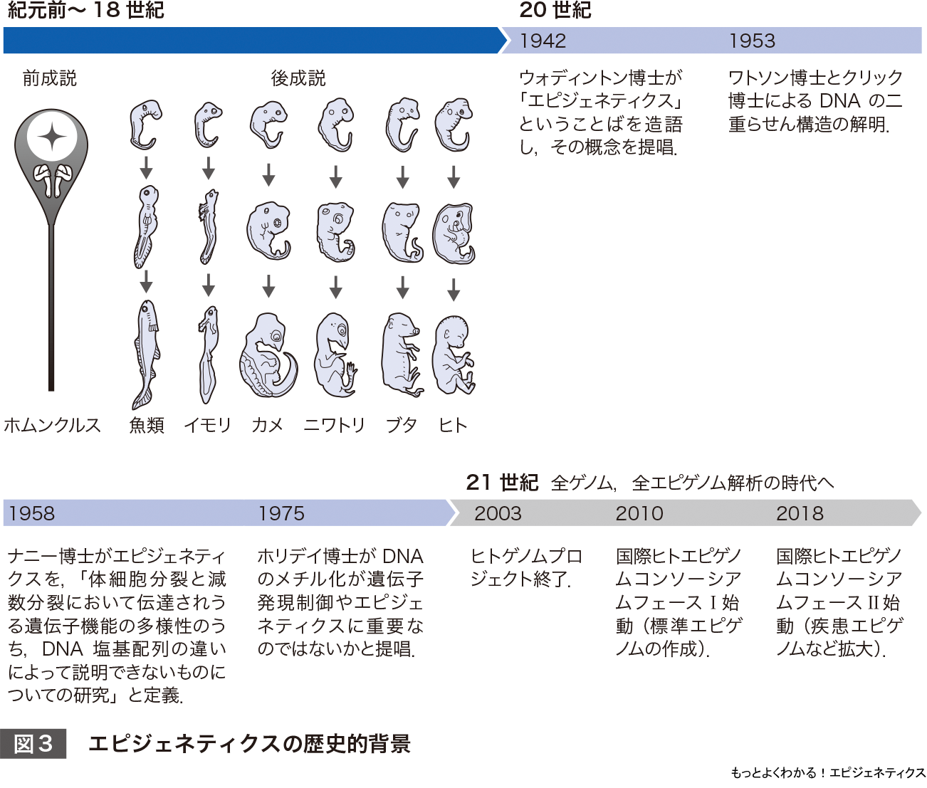 1953年にはDNAの二重らせん構造がジェームズ・ワトソン(James Watson)博士とフランシス・クリック(Francis Crick)博士によって解かれ,遺伝情報の分子実体が明らかになった.すると,1958年にデービッド・ナニー(David Nanney)博士はエピジェネティクスを,「体細胞分裂と減数分裂において伝達されうる遺伝子機能の多様性のうち,DNA塩基配列の違いによって説明できないものについての研究」と定義した.1975年には,ロビン・ホリデイ(Robin Holliday)博士がDNAのメチル化が遺伝子発現制御に重要なのではないかと提唱し,エピジェネティクスが概念ではなく実体をもつようになった.その後,実験的な証拠が集められるとともに,DNAのメチル化に加え,DNAが巻きついているヒストンタンパク質のさまざまな化学修飾(DNAメチル化とヒストン修飾をまとめてエピジェネティック修飾とよぶ)や非コードRNAによるエピジェネティック制御機構が明らかになった.このように,エピジェネティクスは,20世紀後半に成立し,急速に発展してきた新しい学問分野である.エピジェネティクスはゲノムからどのように情報を引き出すかという「ゲノムの高度活用戦略」を研究する学問とも言え,ジェネティクス(遺伝学)と相補しつつ,めざましい発展を続けている.