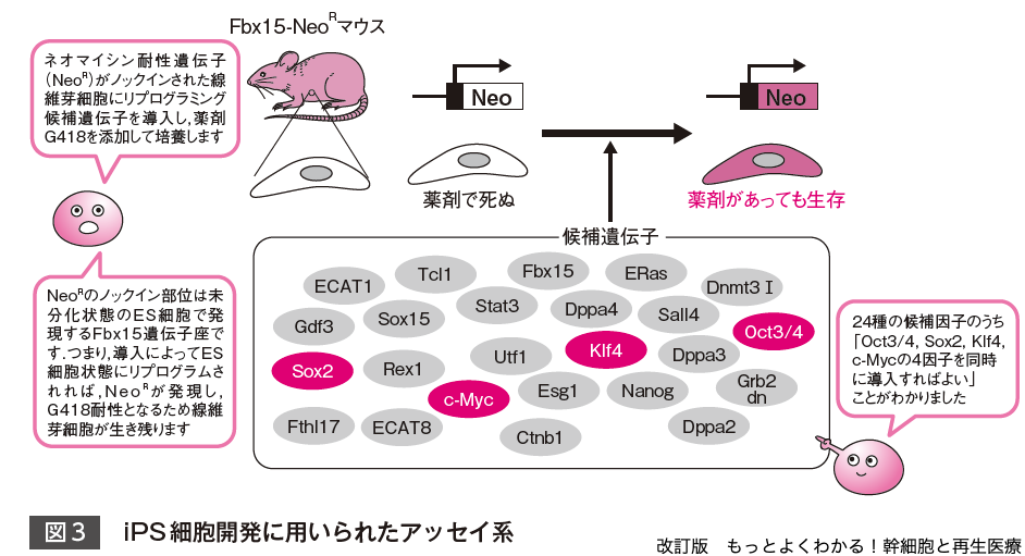 京都大学の山中伸弥らは,前述の受精卵やES細胞に存在する核のリプログラミング誘導因子を探索し,それらを体細胞に導入することでES細胞のような多能性幹細胞を誘導することができるのではないかと考え,研究を開始した.当時,こうしたアプローチはほぼ不可能であると考えられていたが,山中らはまず,アッセイ系を構築した(図3).マウス線維芽細胞にレトロウイルスベクターを用いたリプログラミング誘導因子の候補遺伝子を導入し,ES細胞の性質を獲得するかどうかを検出するアッセイ系である.山中らは以前よりFbx15の解析を進めてきた実績があった.Fbx15はES細胞で特異的に発現しているが,線維芽細胞では発現していない.この遺伝子座にアミノグリコシド系抗生物質に対する耐性遺伝子(ネオマイシン耐性遺伝子:NeoR)を組込んだ,遺伝子改変マウス由来の線維芽細胞を使ったのである.候補遺伝子の導入によって線維芽細胞がES細胞の性質を獲得するとNeoR遺伝子を発現する.その後,G418(アミノグリコシド系抗生物質の一種)による薬剤選択を行えばES細胞の性質を再獲得できた細胞のみが生き残り,導入された遺伝子がリプログラミング誘導因子であることがわかる.