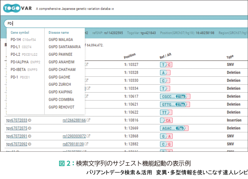TogoVarは,ヒトゲノムのバリアントと疾患の関連についての情報を収集したデータベースであるClinVar10)の情報を取り込んでおり,疾患の名称で検索すると関連するバリアントが表示される.疾患名での検索においても,3文字以上入力するとサジェスト機能が起動する.ただし,サジェスト機能では遺伝子名,疾患名ともに最大10項目までしか表示されないので,検索したい名称が候補に表示されない場合は,検索文字列の続きを入力して候補の表示を絞り込んでほしい.