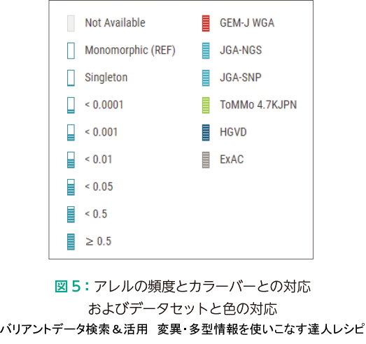 各データセットにおけるオルタナティブアレルの頻度をバーで表示している.バーの高さと頻度,および,色とデータセットの対応は図5のようになっている.