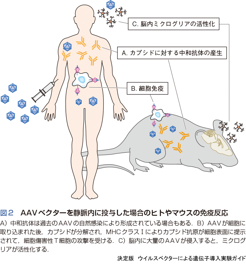 静脈内に投与されたAAV9は,血液脳関門を越えて脳内に侵入する.ウイルスが侵入するとミクログリアをはじめとした脳内免疫系の活性化が考えられる.アデノウイルスベクターなど他のウイルスベクターに比べてAAVは免疫原性がかなり低いことが知られているが,経静脈的に大量のAAVが投与された場合,脳内免疫系の活性化による副作用が懸念される.