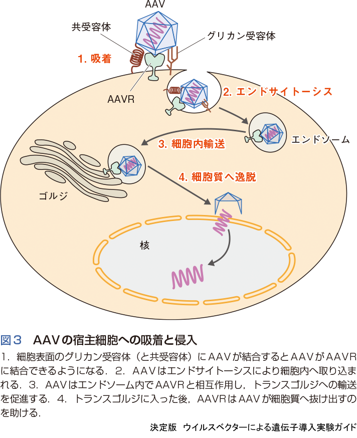 AAVはカプシドが細胞表面の受容体と結合することで細胞への取り込みが開始する.受容体はグリカン受容体(ガラクトースやシアル酸など)および共受容体(ラミニン受容体など)が知られており,血清型により異なる.AAV7,AAV8,AAV10のグリカン受容体はわかっていない.さらにほぼすべての血清型に共通で細胞内輸送にかかわると考えられている受容体,KIAA0319L(AAVR)が2016年に明らかになった14)(図3).AAVは細胞表面の受容体に結合し,AAVRとともにエンドソームに取り込まれてトランスゴルジネットワークに入る.その後,AAVはAAVRから離れて細胞質へ遊離し核へと入る15).この一連の過程を理解し,改良することで細胞種特異的,かつ効率的な遺伝子導入を実現できる可能性がある.