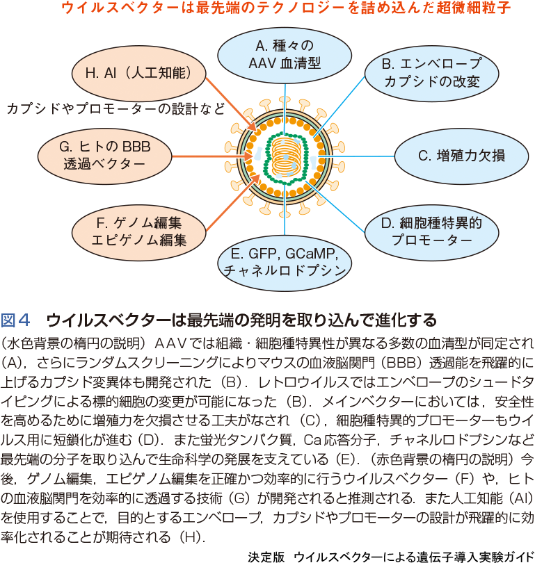 AAVベクターも2000年ごろには作製キットが販売されており,比較的容易に使用できる環境ではあったが,当時のベクターは力価(タイター,titer)が上がりにくく,また精製に手間がかかるため,レンチウイルスの方が主流であった.しかし,2008年ごろからAAVベクターを用いたパーキンソン病やリポタンパク質欠損症などに対する遺伝子治療の臨床的有効性が報告されはじめ,臨床面でAAVベクターに注目が集まり出した.また組織特異性が異なる多くのAAV血清型が分離されたこと,ウイルス粒子の直径は22 nmときわめて小さく,脳など大きな組織においても広範囲に遺伝子導入できることなど,AAVの有用性が徐々に明らかになり,2008年以降,基礎研究でも急速に使用されるようになった(図1D).