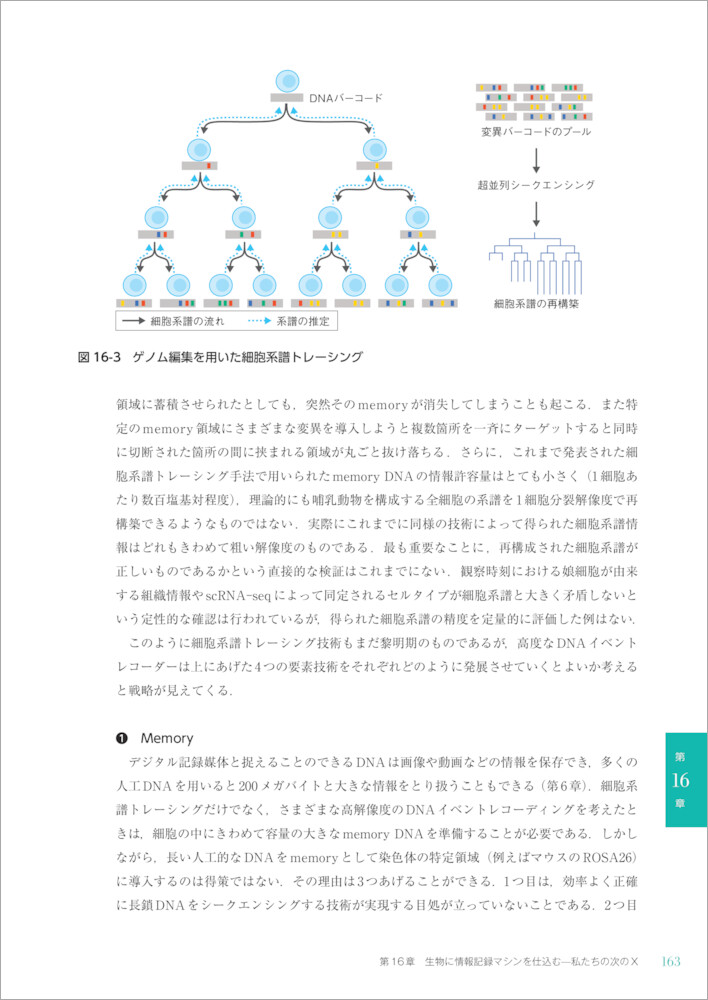 必要が発明の母であるならば,空想は発明の父であろう(ガリレオ・ガリレイが「懐疑は発明の父」であると残したと言われるが,こちらは「友人」くらいでよい気がする).かつてのドラえもんの主題歌にあったように「こんなこといいな,できたらいいな」と夢を見て,仲間達とそれをどうやったら実現できるだろうと積極的に考えて,挑戦してみることはとても楽しい.今の生物学の本質的な限界は何だろうか?生物学が明らかにしたいのにできていないことは何だろうか? それを突破するためにはどんなことができるといいだろうか?それはどうやったらできるだろうか? ──本書の最終章では,私たちのグループが推し進めているDNAイベントレコーディングのビジョンを紹介したい.ぜひこれまでの章を思い出しながら読んでみて欲しい.きっとよりおもしろいと思ってもらえるはずである.…