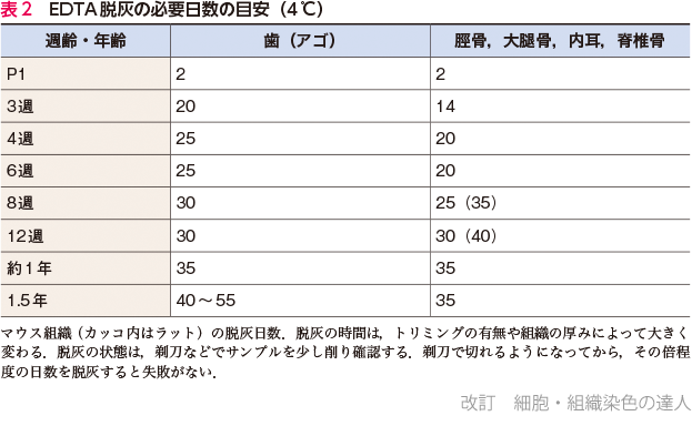 ◆脱灰の必要日数と目安は,ラット膝関節で1~2日間程度.脱灰の状態は,剃刀などでサンプルを少し削り確認する.脱灰時間が長いと染色性が落ちるので,酸脱灰の場合,3日以内に脱灰が終了する程度の大きさにあらかじめ切り出すのが良い.