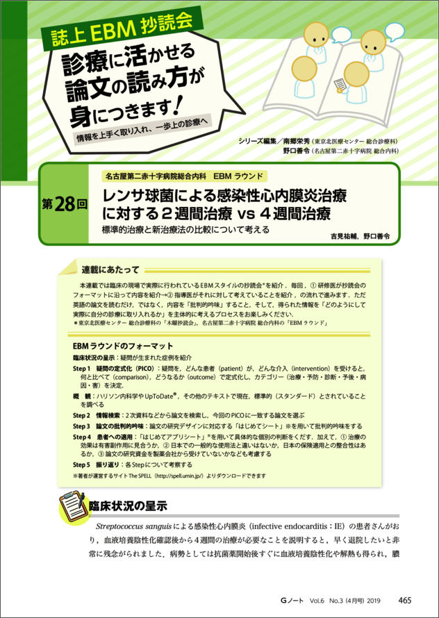 第28回 レンサ球菌による感染性心内膜炎治療に対する2週間治療 vs 4週間治療 〜標準的治療と新治療法の比較について考える【吉見祐輔,野口善令】