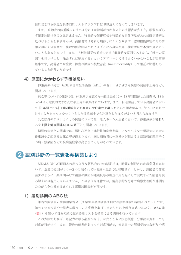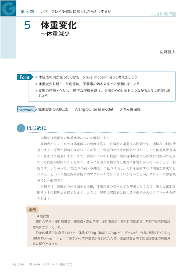 このたび,若林秀隆 教授のご編集により「Gノート増刊フレイル高齢者,これからどう診る?」が上梓された.本書は3つの章から成る. 「第1章:あらためて,フレイルとは何か」においては,“フレイル”という概念,定義するモデル,各ドメインについてレビューされている.特に,社会的フレイルの稿における,フレイルをICF(国際生活機能)分類の3ドメイン:心身機能・構造,活動,参加で捉える生活機能モデルの必要性と,その測定の困難性について興味深く拝読した.そして,総合診療医は,個々の高齢者の生活目線でフレイルに関わるべきであると再認識した.