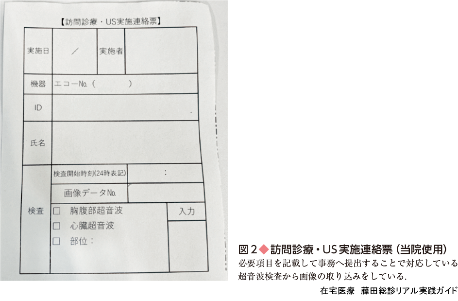 すべての機器が1カ所に集約されており(図1),使用するときに持ち出します.使用後は決まった場所に返すことで紛出しないようにしています.在宅で最も使用するものはポータブルエコーです.超音波検査(US)では重さと解像度で使用する機器を選択しています.個人的にはVscanは持ち運びしやすく,SonoSiteの方が解像度がいいと感じています.スクリーニングの際にはVscanを使用し,より詳細な画像検査をしたい場合にはSonoSiteを使用しています.超音波検査施行後は電子カルテ上で「腹部超音波検査」などの処置オーダーを記録として残します.また当院独自の「訪問診療・US実施連絡票」(図2)に必要項目を記載し,事務へ提出し,画像の取り込みをお願いしています.