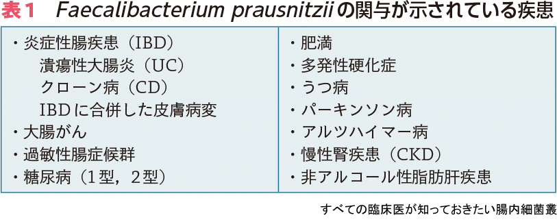 興味深いことに,Faecalibacterium prausnitziiは多発性硬化症の糞便においても低下していることが見出されています.CDと多発性硬化症において類似の炎症を亢進させるシグナルが作用していることが推定され,Faecalibacterium prausnitziiの低下→制御性T細胞の減少→Th17リンパ球の活性化→組織障害といった系が消化管だけでなく,脳組織でもあることが明らかになりつつあります7,8).表1にも示していますが,本菌は糖尿病,神経変性疾患などさまざまな疾患の病態にかかわっています.
