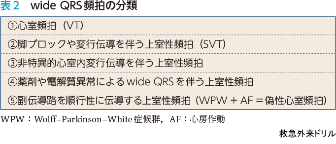全身状態の安定した頻脈の症例です.時間的余裕があれば,電気ショックを急がず,きちんと病歴聴取,身体診察,検査を進めていくことになります.問診では,心疾患や腎疾患の既往を聞いておくことが重要です.wide QRS頻拍の原因は表2の5つに分けられます.