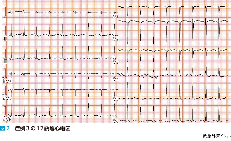 バイタルサイン:意識清明,血圧 122/53 mmHg,心拍数 230回/分,呼吸数 14回/分,SpO2 100%(room air),体温 36.1℃,瞳孔径 3.0/3.0 mm,対光反射 +/+.