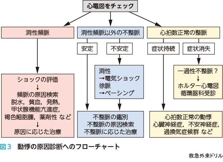 動悸を訴える患者さんに対しては,まず不整脈かどうかをはっきりさせましょう.不整脈の場合,不安定であれば即時電気ショック.安定していれば,不整脈に応じた治療を考えます.不整脈がなく洞性頻脈であった場合には,二次性変化である可能性が高いので,原疾患を考えましょう.心拍数が正常であれば,心臓神経症,不安神経症などを念頭に診察を進めます.