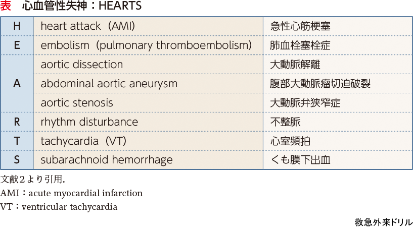 本症例を改めて考えてみましょう.48歳女性でACSというのは若すぎますよね.そもそもの前医受診時の主訴は意識消失です.それが失神なのだとしたら,心血管性失神(覚え方はHEARTS,表)として,ACS以外に肺血栓塞栓症,大動脈弁狭窄症,大動脈解離,くも膜下出血などを考える必要があり,発症時の痛みや聴診所見,下肢のDVT(deep vein thrombosis:深部静脈血栓症)の有無をチェックしたくなるはずです2).心電図は意識消失患者では必須の検査ですが,ACS以外に上記の疾患をすぐに思い浮かべ,さらにはSAHの心電図所見を理解しておかなければ,confirmation biasに陥ります.ACSだと思って心電図を読むのと,いくつかの鑑別疾患を頭に入れて読むのとでは違いますよね.患者さんに,「気を失う前後でどこかに痛みがありませんでしたか?」と聞くと,「頭が痛く,いまも若干痛みがあります」という返答でした.冷静に考えればなぁんだと思うかもしれません.しかし,“この疾患のはずだ”と決めつけて対応すると,このような基本的事項を確認し忘れることはあるあるです.心筋梗塞だと思ったら大動脈解離,脳卒中だと思ったら痙攣後のTodd麻痺,片頭痛だと思ったら帯状疱疹,これらのエラーはよくあることです.さらに,それらに加えて本症例のように,前医から,上級医から,さらには専門医から意見を言われたらどうでしょうか? おそらくoverconfidence biasによって,思考停止へと陥ります.「◯◯先生がそう言ったので…」ではなく,自身で評価することを怠らないようにしましょう.
