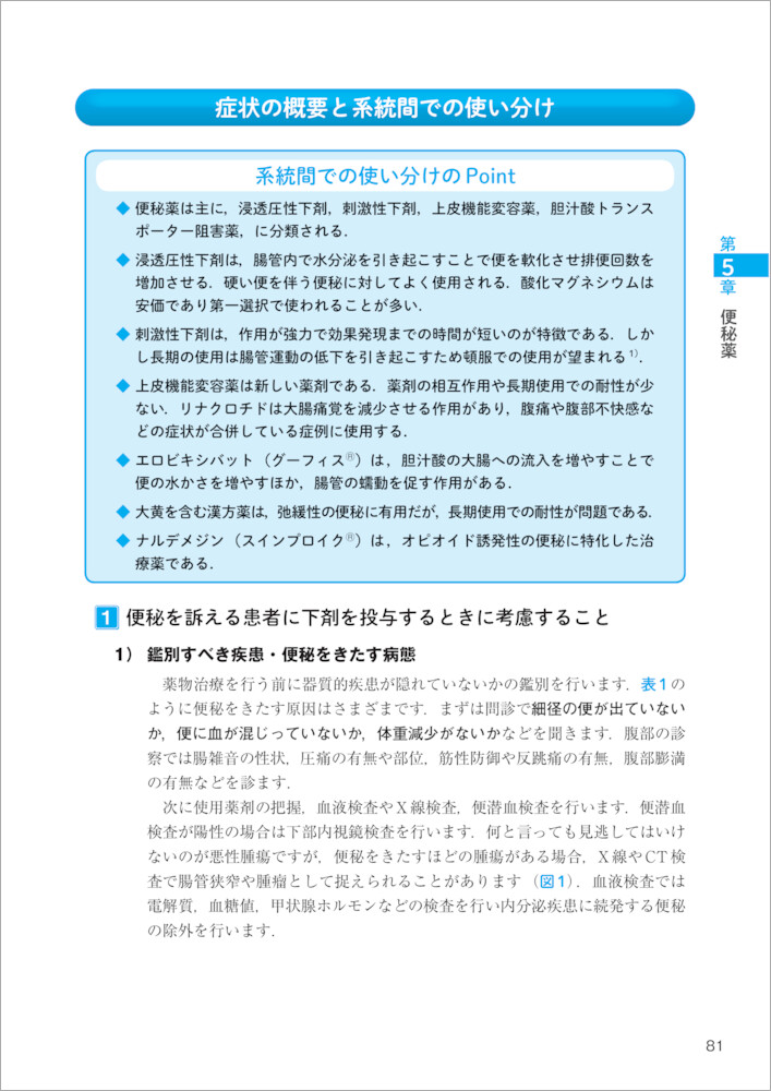薬物治療を行う前に器質的疾患が隠れていないかの鑑別を行います.表1のように便秘をきたす原因はさまざまです.まずは問診で細径の便が出ていないか,便に血が混じっていないか,体重減少がないかなどを聞きます.腹部の診察では腸雑音の性状,圧痛の有無や部位,筋性防御や反跳痛の有無,腹部膨満の有無などを診ます.