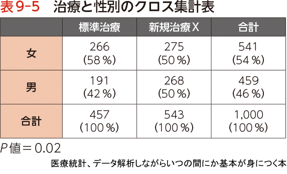 したがって,この結果は,全体の人数は1,000人で,新規治療Xなし群の女性は266人(58%),男性は191人(42%),新規治療Xあり群の女性は275人(51%),男性は268人(49%)であり,そのカイ二乗検定の結果はP値0.017であると読みとれます.これは「新規治療Xと標準治療の2群間には,男女の割合の差を認める(P=0.02)」と解釈します.