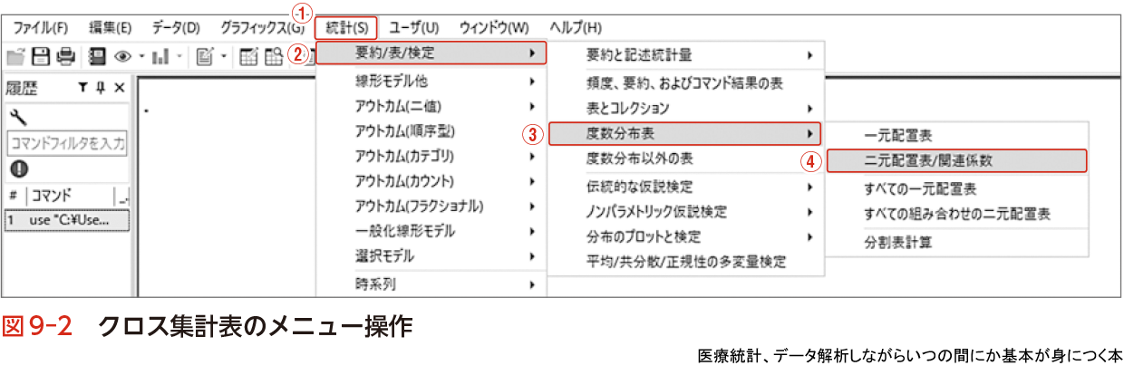 ❶メニューバーから「統計」→「要約/表/検定」→「度数分布表」→「二元配置表/関連係数」を選択.