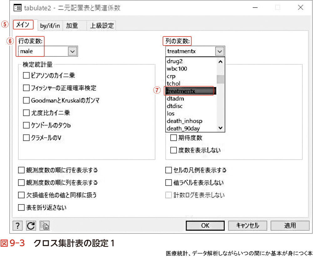 ❷メインタブの「行の変数」は“male”を選択→「列の変数」は“treatmentx”を選択.