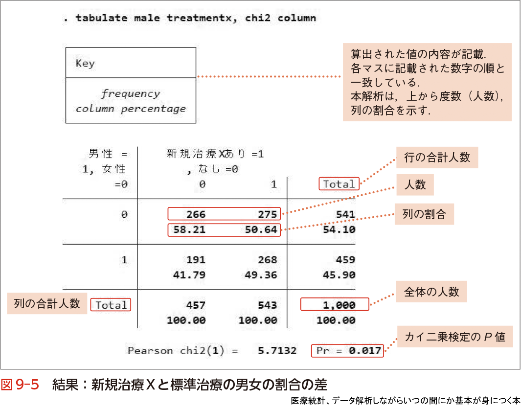 結果は図9-5のようになります.さまざまな値が出力されますが,左上のKeyと書かれている四角い枠のなかに,クロス集計表の各欄に出力されている値の内容が表示されます.本表の各欄の数値では上からfrequency(度数,人数),column percentage(列の割合)をあらわしていることがわかります.表の下にある「Pearson chi2(1)=」が検定統計量(カイ二乗値),「Pr=」がカイ二乗検定のP値です.