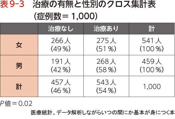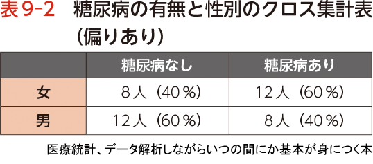 カイ二乗検定では,まず集計された結果から作成されたクロス集計表をもとに,理論上の期待値からなるクロス集計表を作ります.糖尿病の有無と性別の例では実際に集計されたクロス集計表が表9-2であり,その理論上の偏りのない表が表9-1です.そして,偏りのない理論上のクロス集計表と実際のクロス集計表を比べて偏りを検定します.具体的には,その2つの表から検定統計量(カイ二乗値)を算出し,その値とサンプル数からP値の概算をします.