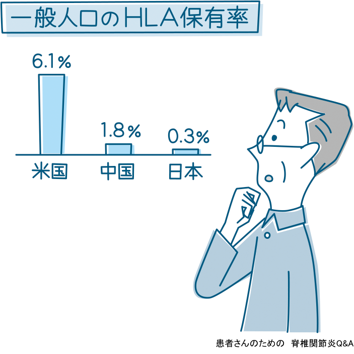 いまだはっきりした原因が特定されていないのが現状ですが、これまでの海外の疫学調査から、強直性脊椎炎の発病には、白血球にある抗原のHLA-B27(p.18参照)が関連しているといわれています。しかし、HLA-B27を保有している人のすべてが発病するわけではなく、発病する可能性があるのはHLA-B27を保有している人の10%以下であると報告されています。一方で、一般の人口におけるHLA-B27の保有率は米国では6.1%、中国では1.8%であるのに対して、日本では0.3%と低く、このことは海外との強直性脊椎炎の有病率の違いを反映していると考えられます。