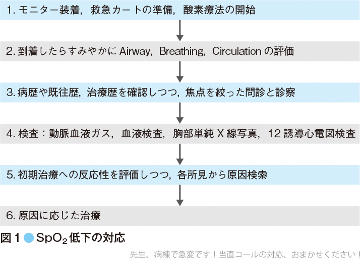 SpO2低下に限らず,バイタルサインの異常は緊急事態ですので,ギアを上げてすみやかに対応しましょう.「後で行きますね」は通用しませんよ.SpO2低下のコールを受けたら図1の順番で初期対応をします.