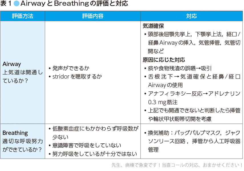 Airwayの評価として気道が開通しているか,が重要です.Airwayの評価は発語があるか,上気道狭窄音(stridor)が聴取されるかなどで行います.Breathingの評価としては適切な呼吸努力をしているかが重要となります.「SpO2低下なのに頻呼吸じゃない」「意識障害があり,除呼吸である」「努力呼吸はしているが,十分ではない」などです.それぞれの対応に関して表1にまとめておきます.アナフィラキシー反応に関しては喘鳴(wheezes)の聴取(Airwayが開通していないとそもそも聴取困難)や蕁麻疹,顔面の腫脹などの傍証を探すことも重要ですが,目立たないこともあるので注意が必要です.直前に使用した薬剤や摂取した食事なども確認しましょう.