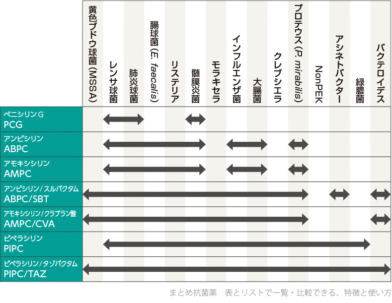 - ❶ 殺菌性で、有効性の高いβラクタム薬の一種。多くの細菌感染症の第一選択薬