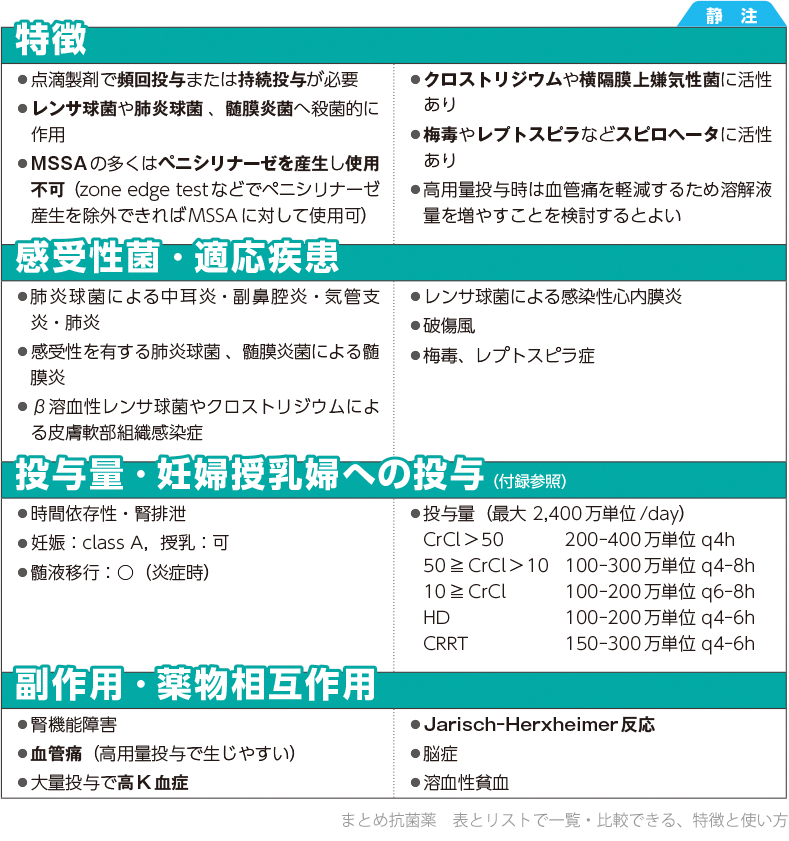 高K血症と血管痛:PCG100万単位中カリウムが1.53 mEq含まれるため末梢点滴から投与する場合、カリウム濃度と投与速度に注意が必要です。また高用量を投与すると血管痛や静脈炎が生じやすいため、溶解液量を増やす(例えば通常1回投与あたり100 mLの溶解液を250 mLに増量する、または500 mLに溶かし持続投与にする)、長時間(例えば2時間以上)かけて投与するとよいでしょう。