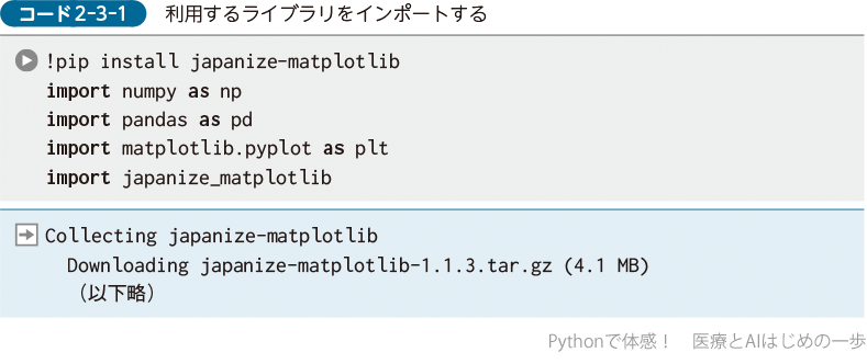 まずは,演習データDLサイト(➡p.12参照)からダウンロードした2章のノートブック(chap2.ipynb)をColabで開き,次のコードを実行します.