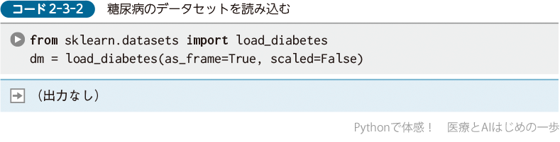 scikit-learn(サイキットラーン,Pythonのコード上ではsklearnと書きます)は,Pythonで利用できるデータ分析や機械学習のためのライブラリの一つです.load_diabetesはsklearnライブラリに含まれるdatasetsモジュールにある,diabetes(糖尿病)のデータを読み込むための関数です.モジュールに含まれる関数だけを利用できるようにしたいときは,「from ライブラリ名.モジュール名 import 関数名」を実行します.