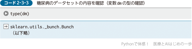 読み込んだdmの型を調べるため,「type(変数名)」を実行します.dmに格納した糖尿病のデータセットは,Bunch型というdictionary(辞書)型の一種になっています.辞書型は1章-2-3でも触れたように,