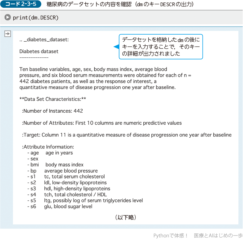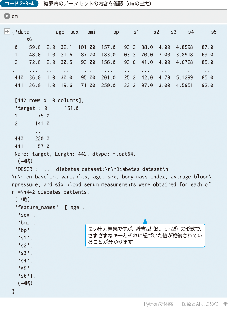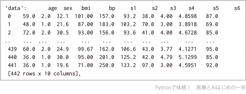 コード2-3-3で調べたように,型はBunch型であり,コード2-3-4で調べたように,キーとデータの組み合わせが複数入っています.キーとして,'data','target','DESCR','feature_names'などがあり,キーの後にそれぞれのキーと紐づいたデータが格納されています.以下の部分では,キーが'data',その後のage列〜s6列で0〜441行のデータフレーム(442行×10列)が,データ内容として入っています.