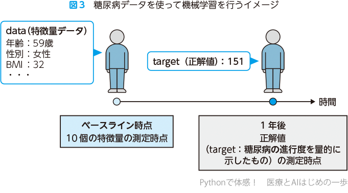 ここで糖尿病データでの解析デザインのイメージを図3に示します.ベースライン時点で,特徴量のデータを442人の患者から取得しています.その人たちに対し,ベースライン時点から1年後の糖尿病の進行度を評価しています(研究における測定開始時点をベースラインと呼びます).したがって機械学習を行うには,特徴量(data)と正解値(target)のデータをそれぞれ準備する必要があります.