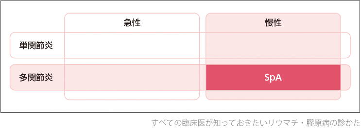 SpAの発症様式は,慢性多発関節炎です.したがって,発症様式からはSpAとRAとは区別することができません.ただし,RAが典型的な多関節炎(poly-arthritis)を示すのに対して,SpAでは罹患関節数がそれに比べてやや少ないため,少関節炎(oligo-arthritis)と呼ばれることもあります.また,SpAでは,罹患関節が少ないために罹患関節が非対称性にみえることも多いです.そのため,RAでは対称性の多関節炎(symmetrical poly-arthritis)であるのに対し,SpAでは非対称性の少関節炎(asymmetrical oligo-arthritis)で発症するとの考え方もあります.すなわち,どちらも同じ「慢性多関節炎」ですが,RAとSpAとでは罹患関節の数や対称性が異なっているのです.